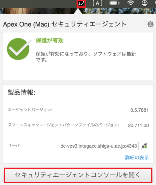 2月4日(水)より、macOS 26 Tahoe 上でApexOneの新規インストールができるよう対応しました。既にインストール済みの端末については、学内ネットワーク接続時に順次アップデートが行われます。その際再起動を求められることがあります。