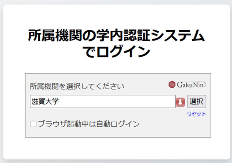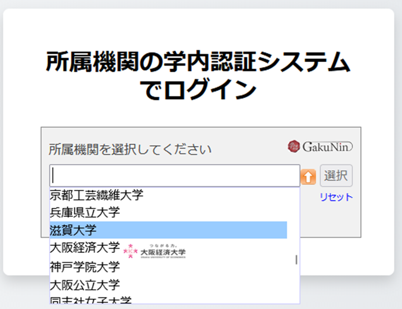 2. 「所属機関の学内認証システムでログイン」画面で、ドロップダウンメニューから「滋賀大学」を選択します。