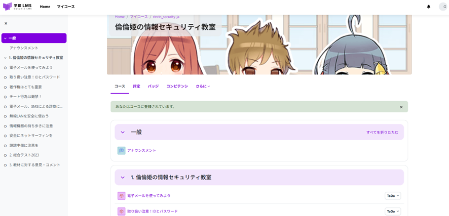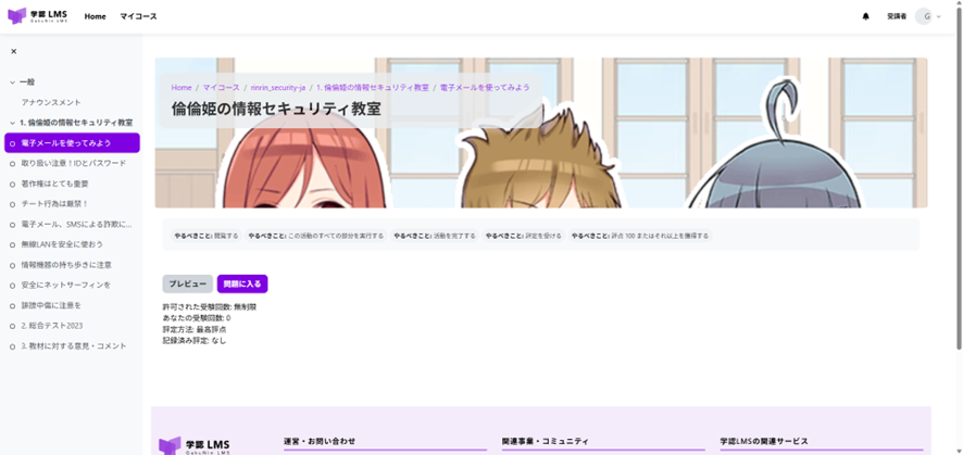 以下の受講方法に従い、 国立情報学研究所学認LMS の情報セキュリティ教材(倫倫姫)の「倫倫姫の情報セキュリティ教室」を受講してください。