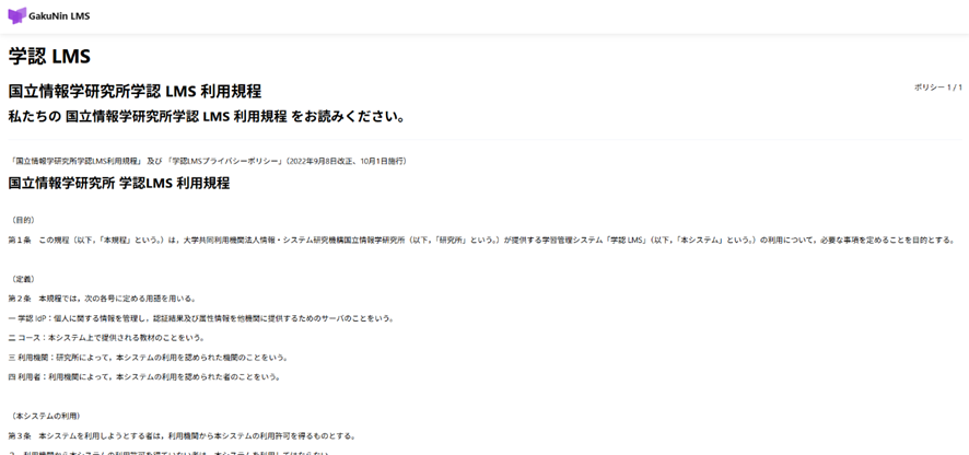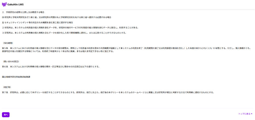 5. 「学認LMS」にログインできたので、「国立情報学研究所学認LMS利用規程」を確認・下にスクロールし、「次へ」ボタンをクリックします。