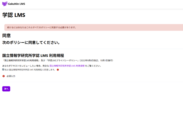 6. 「私は国立情報学研究所学認LMS利用規程に同意します」にチェックをいれて、「次へ」ボタンをクリックします。