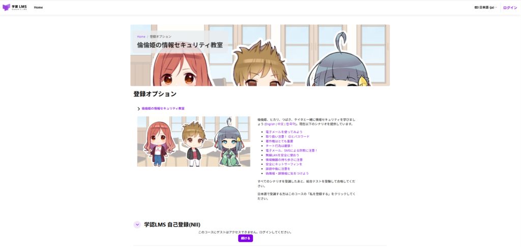 1. 国立情報学研究所の学認LMS「倫倫姫の情報セキュリティ教室」のページにアクセスします。以下の画面が表示されたら、ページ下部の「続ける」をクリックします。